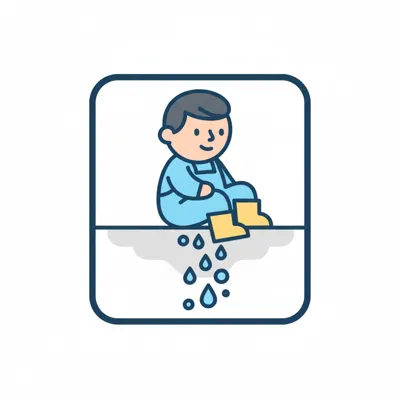 Kind in blauer Latzhose und gelben Stiefeln sitzt, Wasser tropft von den Füßen.