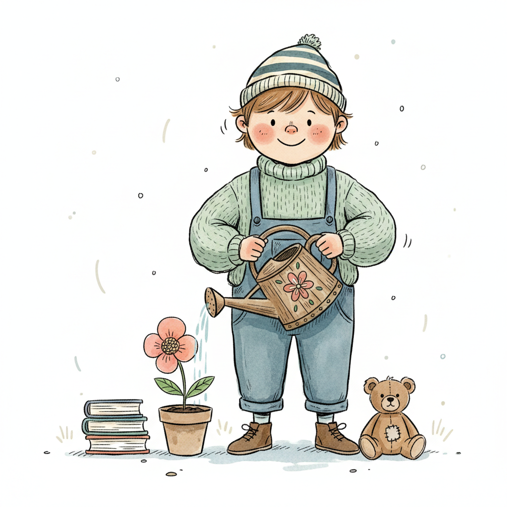 Niedliches Kind gießt eine Blume, daneben Bücher und Teddybär. Süße Aquarell-Illustration.