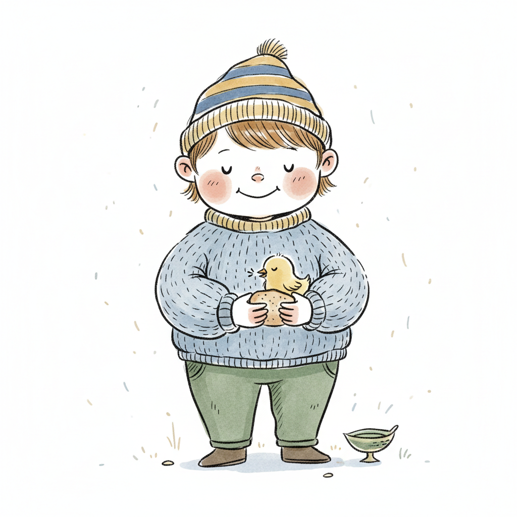 Niedliche, kindgerecht illustrierte Szene mit einem Kind oder einer Person als Hauptfigur, vor rein weißem Hintergrund, im frech-nordischen Aquarell-Skizzenstil. Klare, leicht wackelige Tuschekonturen, sichtbare Pinsel- und Strichtextur, dezente Schraffuren, weiche handgemalte Farbflächen in gedeckten Farben. Einfache, runde Formen. Keine harten Schatten, sondern sanfte, transparente Aquarellschichten. Leicht raue, handgezeichnete Linien statt glatter Vektorkanten. Subtile, vereinzelte Kritzelpunkte oder kleine Details im Hintergrund (wie Pünktchen oder feine Striche), aber keine echte Umgebung oder Landschaft. Die Figur ist mittig zentriert. Insgesamt charmant, humorvoll, warm und handgemacht wirkend. WICHTIG: Das Bild darf ABSOLUT KEINEN TEXT, KEINE BUCHSTABEN und KEINE ZAHLEN enthalten.