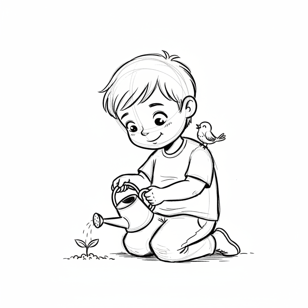 Ein Junge gießt eine Pflanze, ein Vogel sitzt auf seiner Schulter. Schwarz-Weiß-Zeichnung.