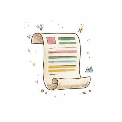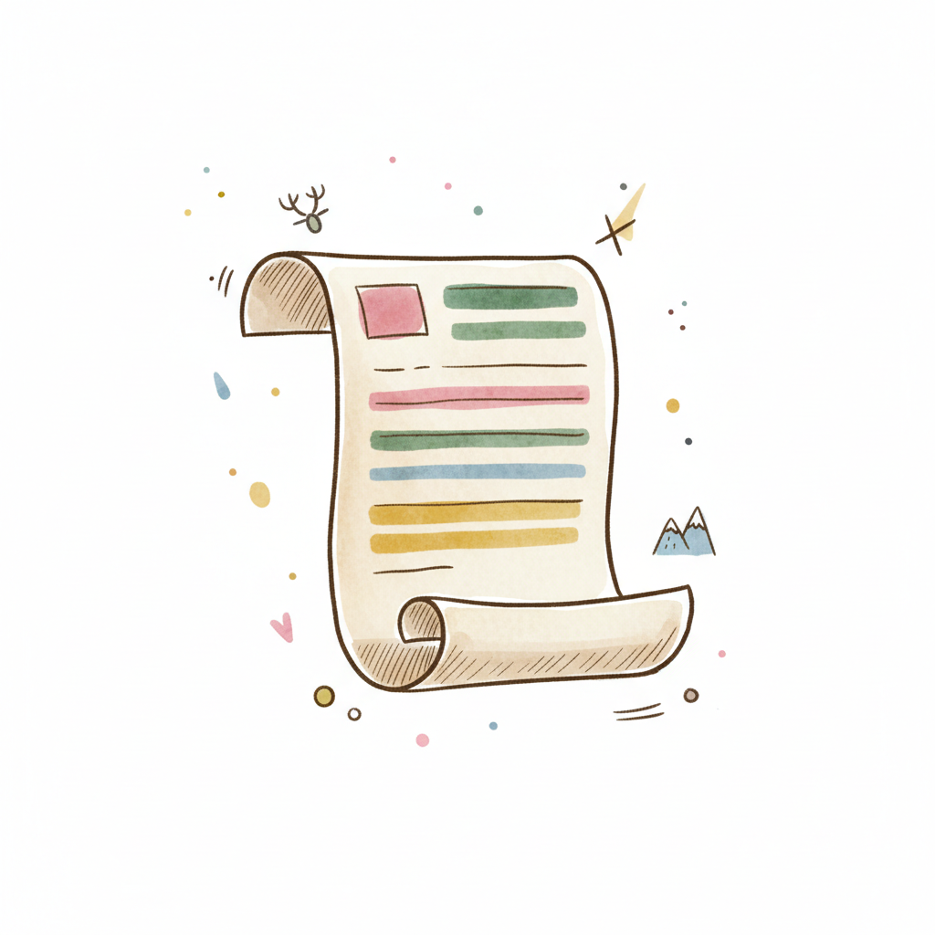 Aquarell-Illustration eines gerollten Dokuments mit farbigen Linien und verspielten Details.