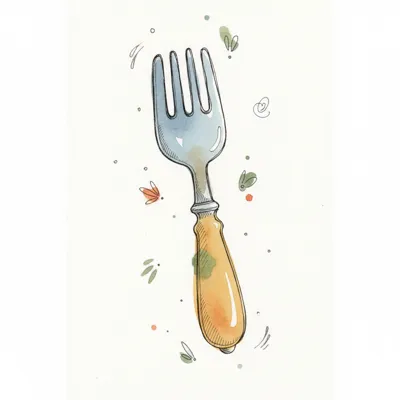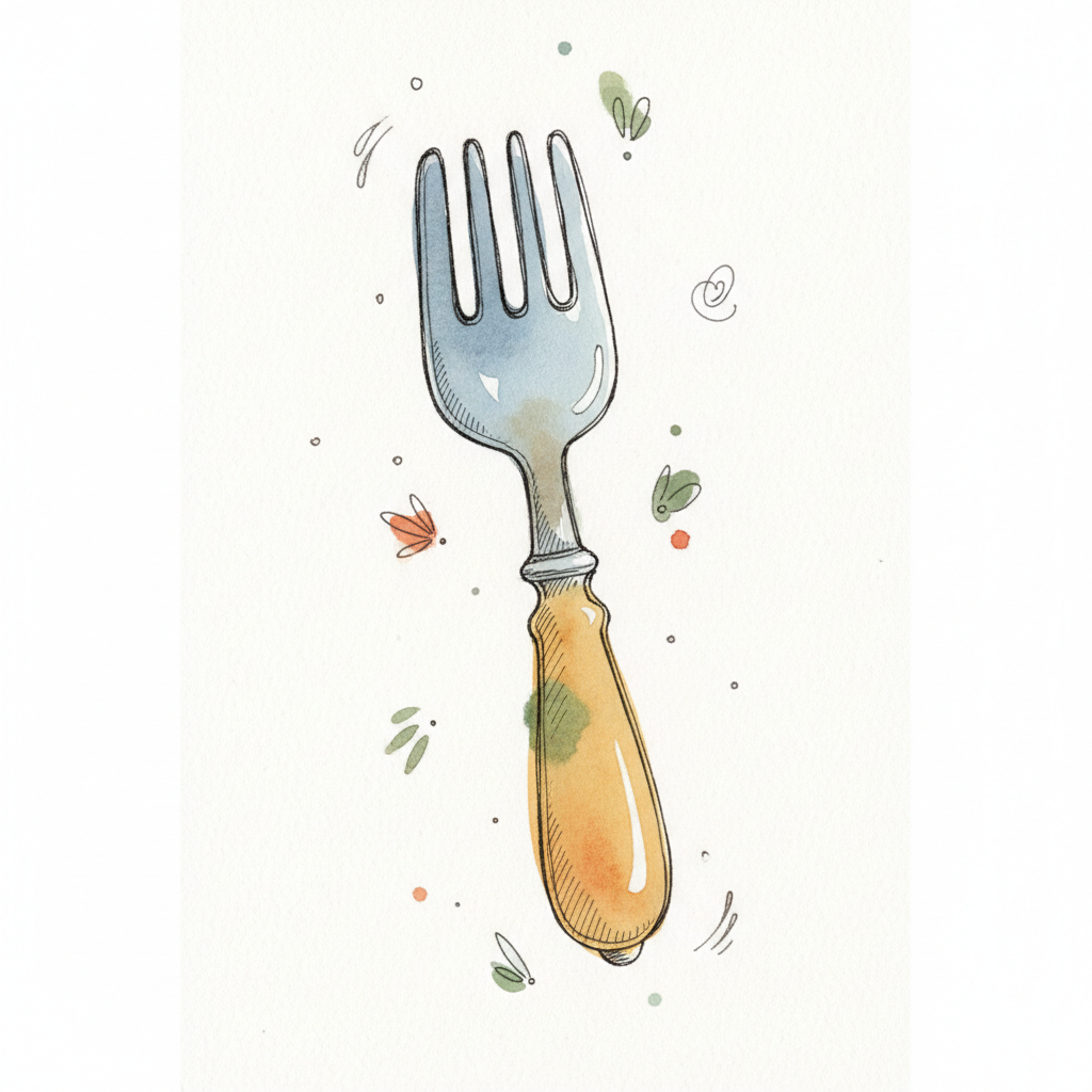 Bunte Aquarell-Illustration einer Gabel mit hellem Griff und verspielten Details auf weißem Grund.