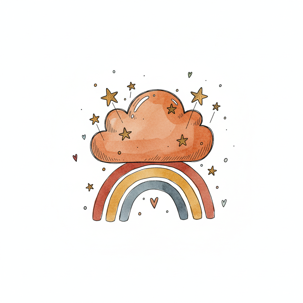 Verspielte Aquarellzeichnung: Eine orangefarbene Wolke mit Sternen über einem Regenbogen.