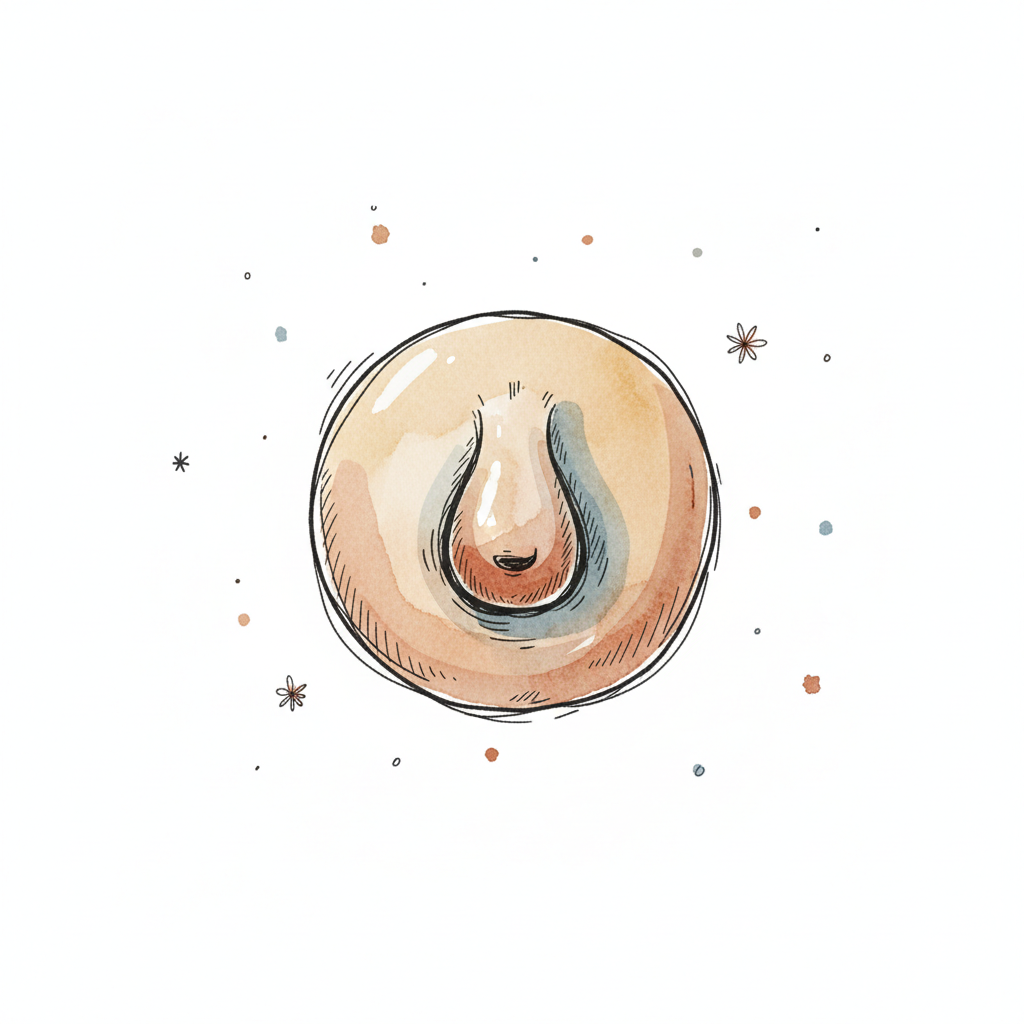 Verspielte Aquarellillustration eines runden, beigen Objekts mit einer blauen Vertiefung, umgeben von Punkten.