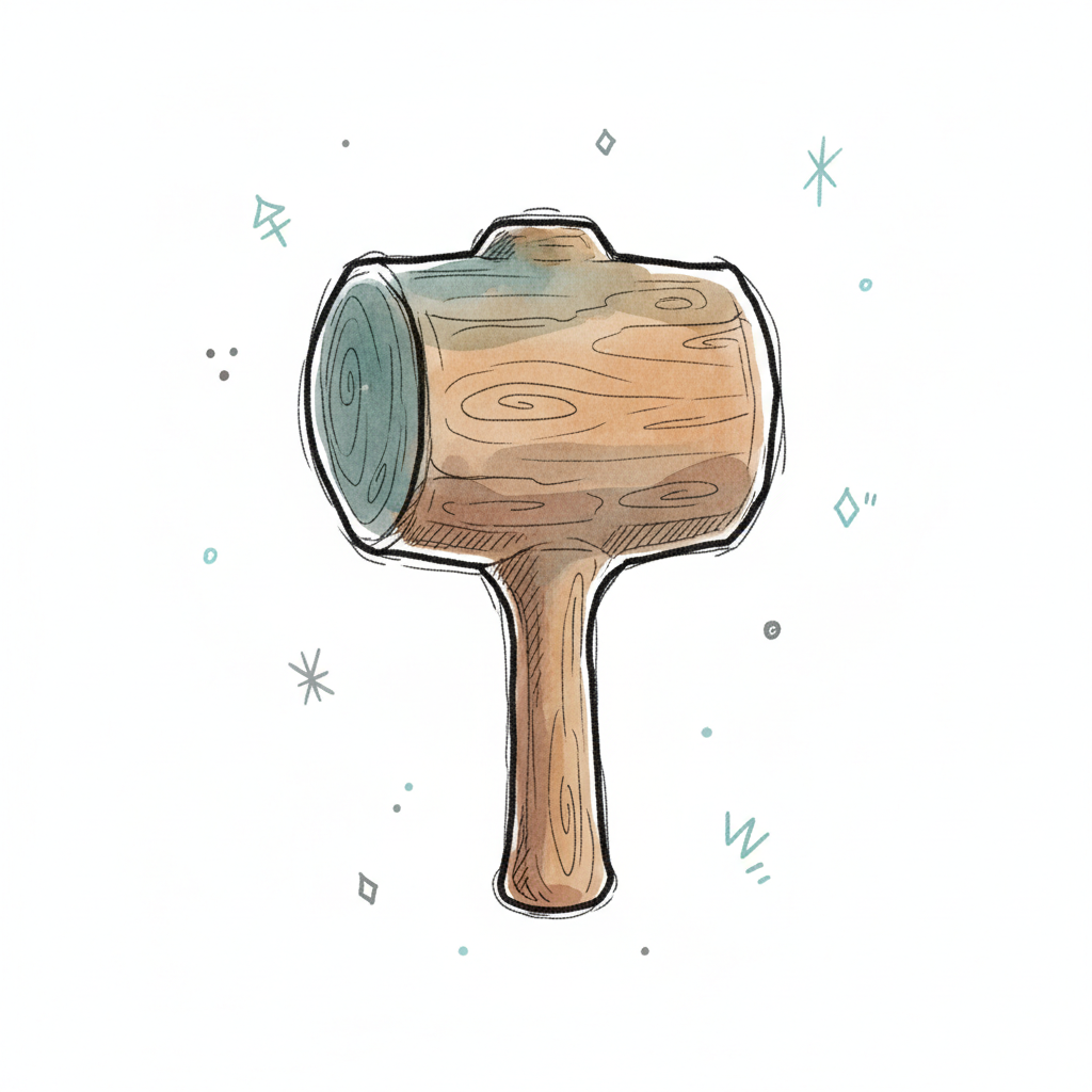 Holzhammer-Illustration in Aquarell mit verspielten Details auf weißem Hintergrund.