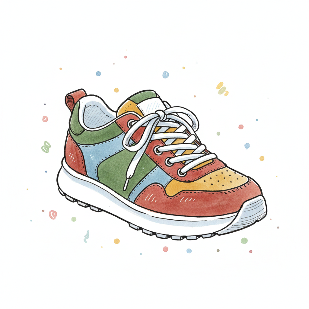 Bunter Sneaker im Aquarell-Stil mit weißen Schnürsenkeln und verspielten Farbspritzern.
