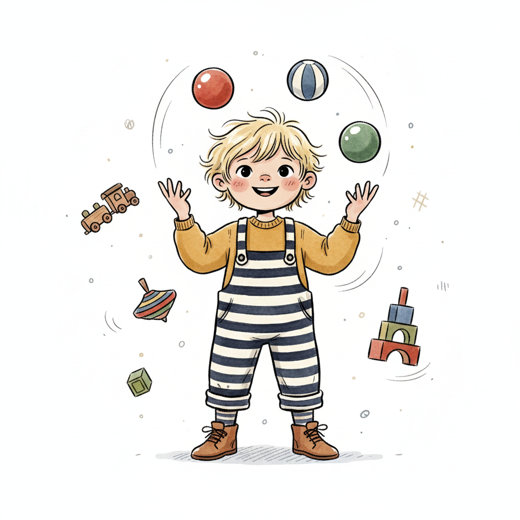 Fröhliches Kind jongliert Bälle und Spielzeug in einer verspielten Illustration.