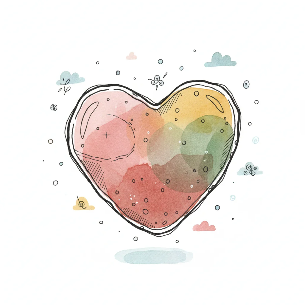Buntes Aquarell-Herz mit skizziertem Umriss und verspielten Details auf weißem Hintergrund.