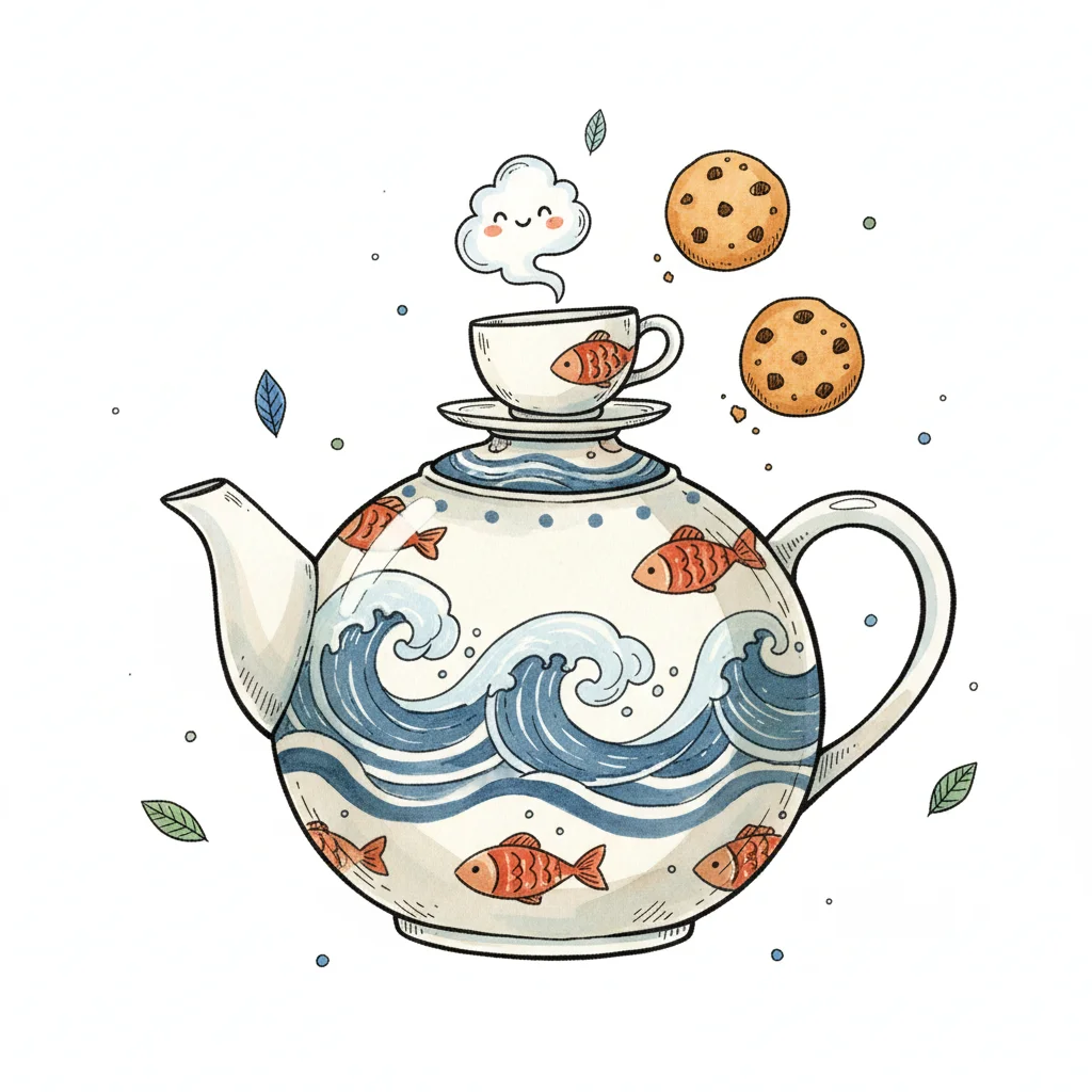 Eine verspielte Teekanne mit Wellen- und Fischmuster, darauf eine Tasse mit lächelndem Dampf und Keksen.