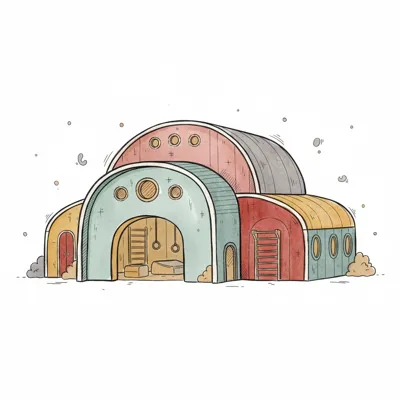 Buntes, verspieltes Gebäude mit runden Formen und verschiedenen Räumen, im Cartoon-Stil gezeichnet.