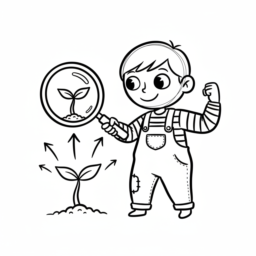 Glücklicher Junge mit Lupe untersucht wachsende Pflanze, symbolisiert Entdeckung und Natur.