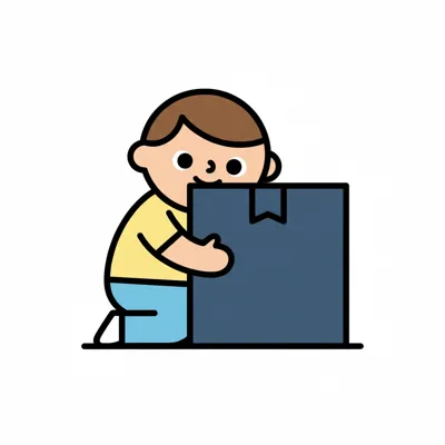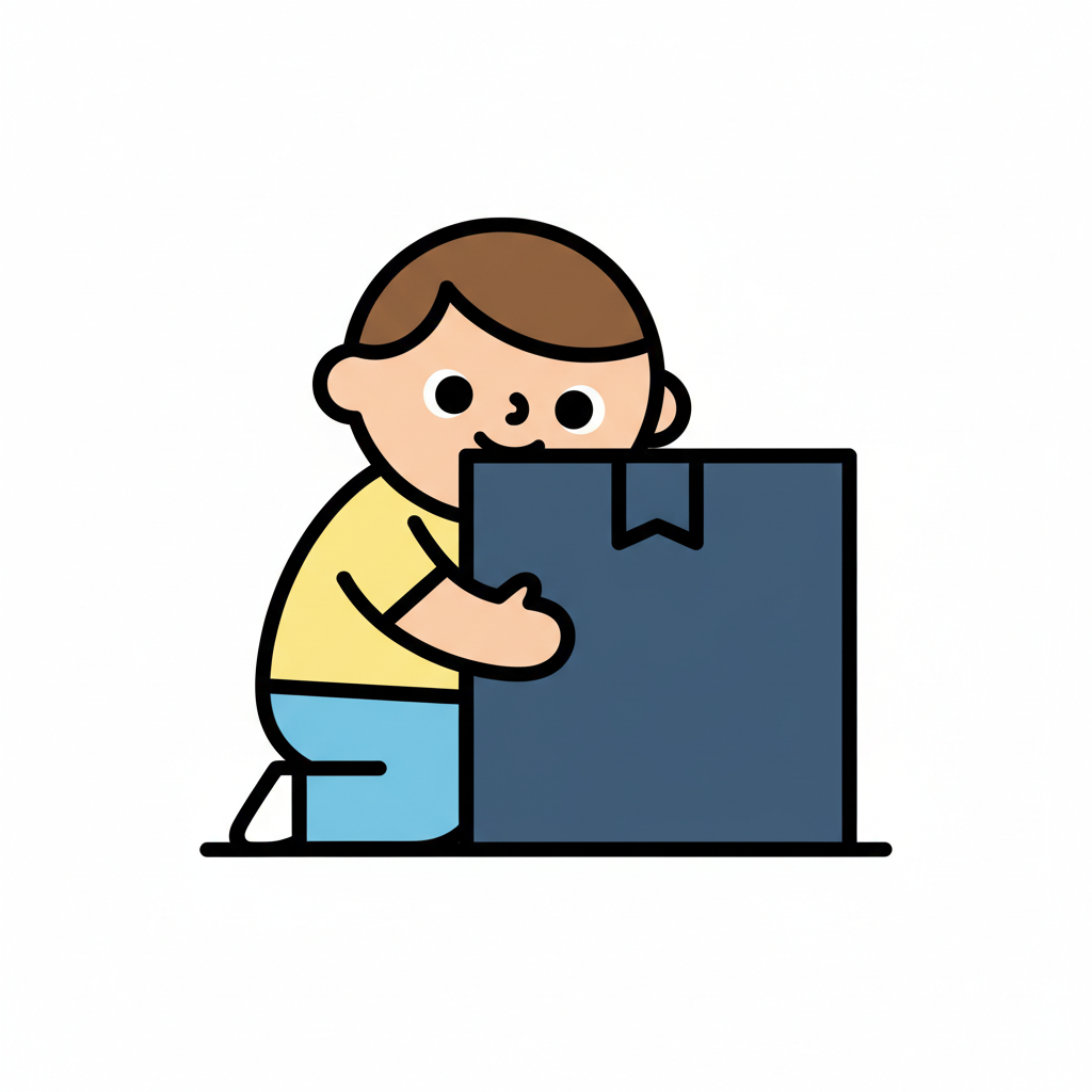 Ein Kind kniet und umarmt eine große Box.