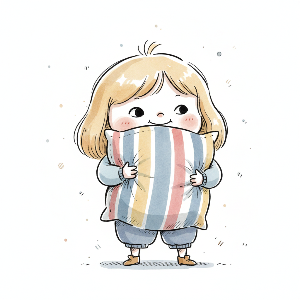 Handgezeichnete Kinderbuchillustration im modernen skandinavisch-nordischen Stil. Minimalistische, freundliche Figur mit einfachen Formen und leicht unregelmäßigen, handgezeichneten Linien. Ruhige, gedeckte Farbpalette, viel freie Fläche, reduzierte Details, sanfte Papier- oder Aquarellstruktur. Warme, ruhige, leicht humorvolle Stimmung, flächige Komposition ohne starke Perspektive, moderner nordischer Illustrationsstil, charmant und zeitlos.