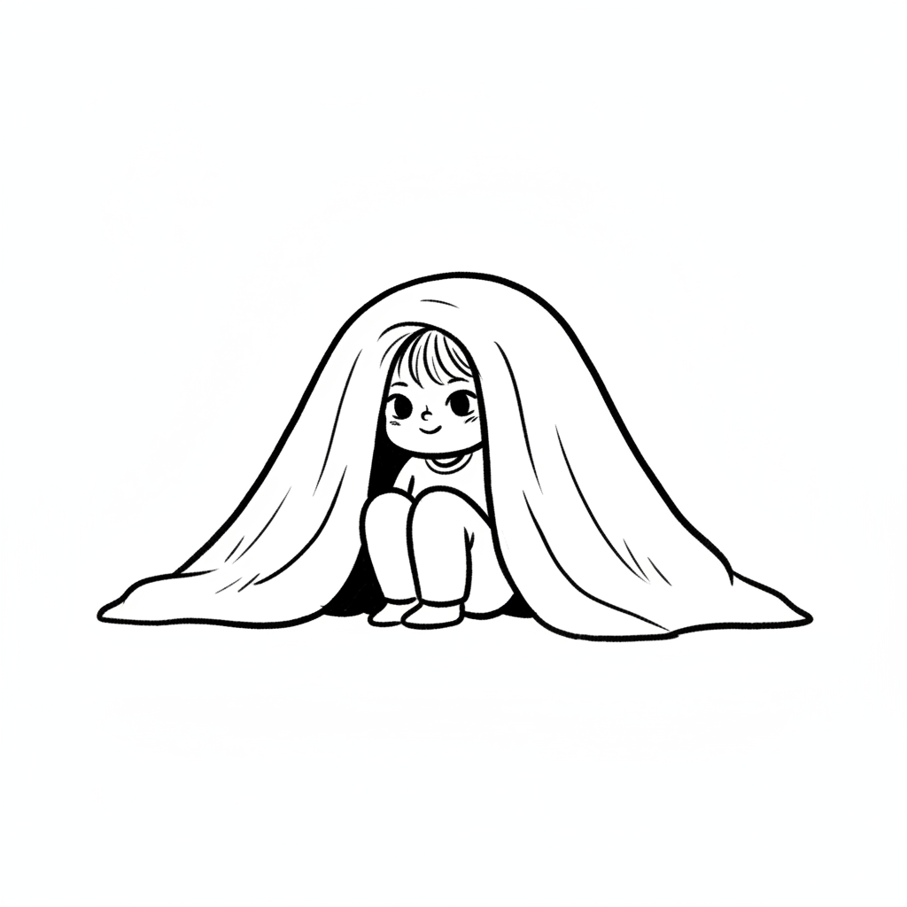 Ein Kind sitzt unter einer Decke und schaut neugierig heraus.