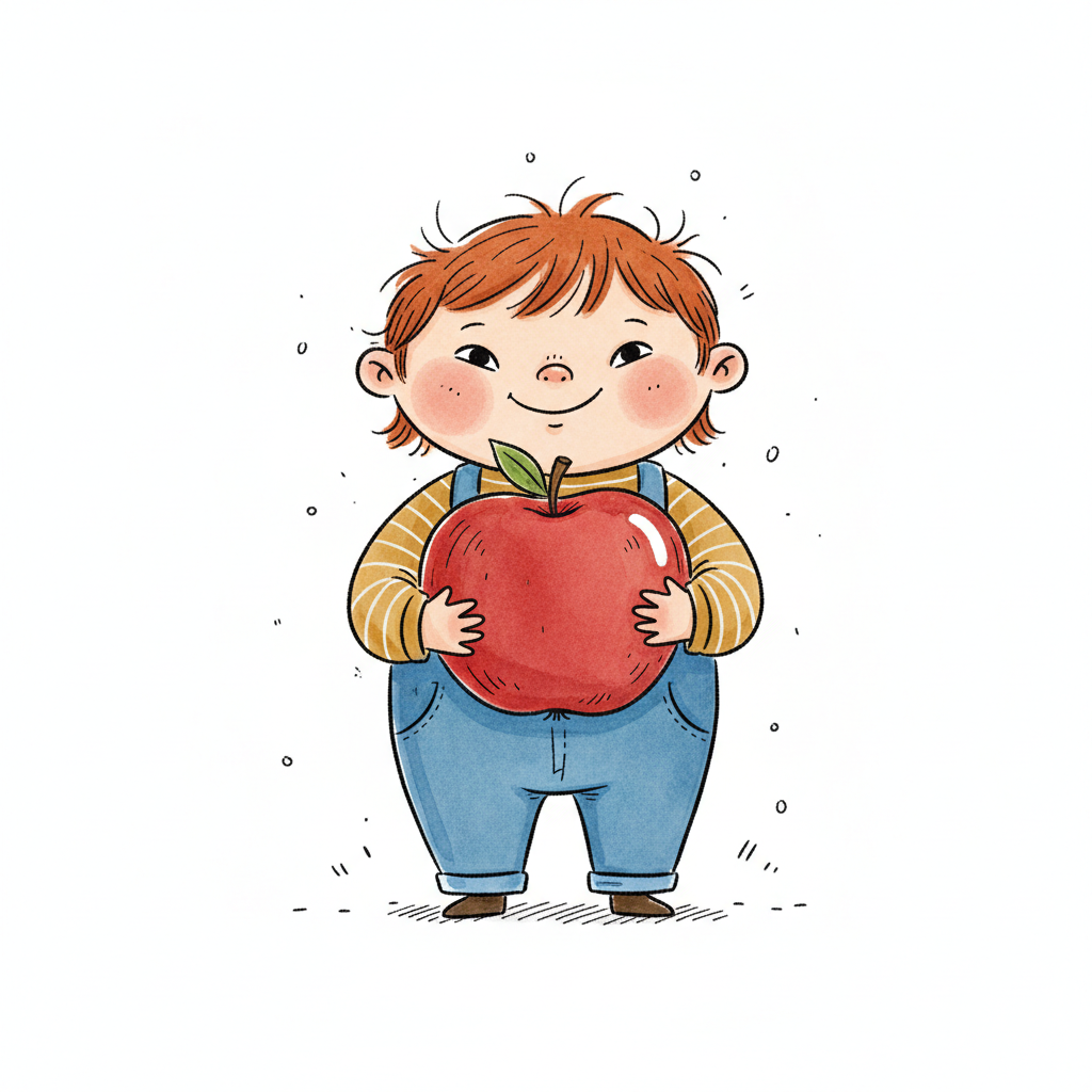 Niedliche, kindgerecht illustrierte Szene mit einem Kind oder einer Person als Hauptfigur, vor rein weißem Hintergrund, im frech-nordischen Aquarell-Skizzenstil. Klare, leicht wackelige Tuschekonturen, sichtbare Pinsel- und Strichtextur, dezente Schraffuren, weiche handgemalte Farbflächen in gedeckten Farben. Einfache, runde Formen. Keine harten Schatten, sondern sanfte, transparente Aquarellschichten. Leicht raue, handgezeichnete Linien statt glatter Vektorkanten. Subtile, vereinzelte Kritzelpunkte oder kleine Details im Hintergrund (wie Pünktchen oder feine Striche), aber keine echte Umgebung oder Landschaft. Die Figur ist mittig zentriert. Insgesamt charmant, humorvoll, warm und handgemacht wirkend. WICHTIG: Das Bild darf ABSOLUT KEINEN TEXT, KEINE BUCHSTABEN und KEINE ZAHLEN enthalten.
