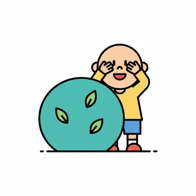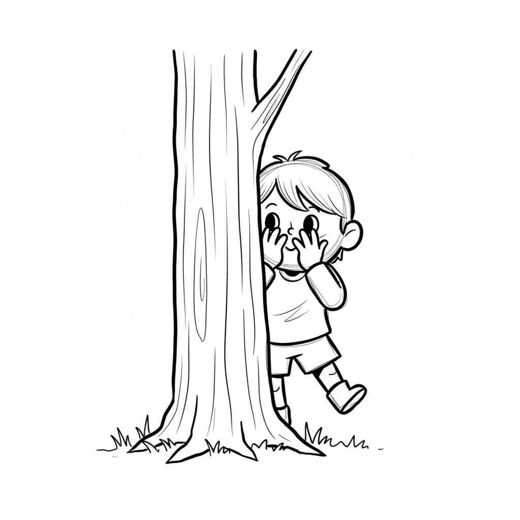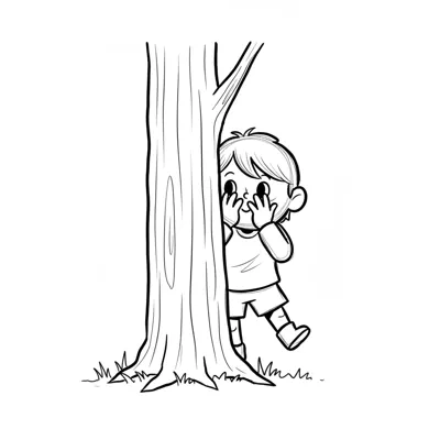 Ein Kind spielt Verstecken hinter einem Baum.
