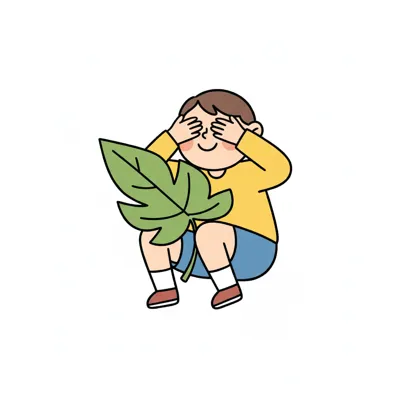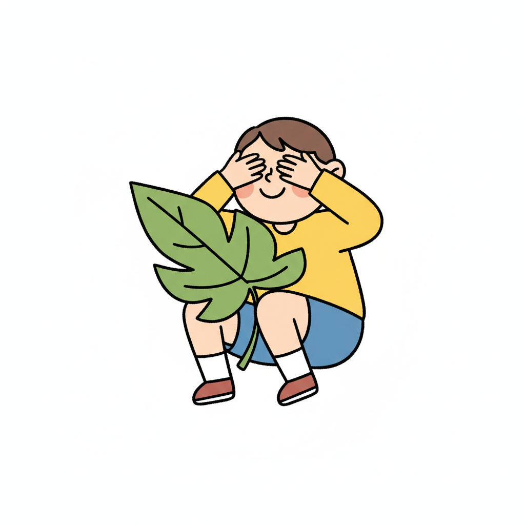 Ein Junge sitzt mit geschlossenen Augen und einer großen Blattpflanze.