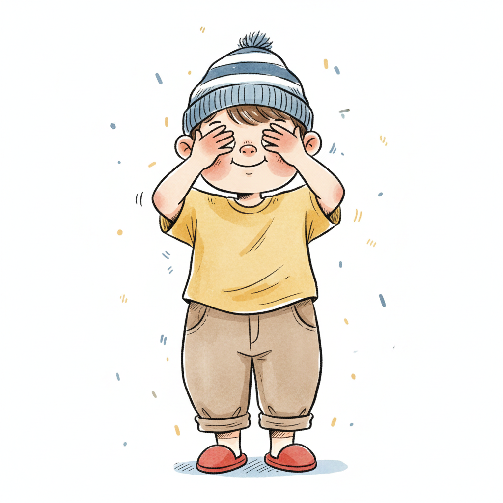 Ein fröhlicher Junge mit einer Mütze, der sich die Augen zuhält.