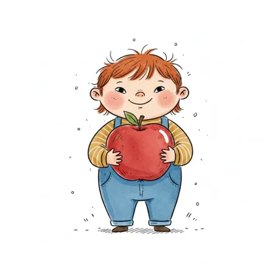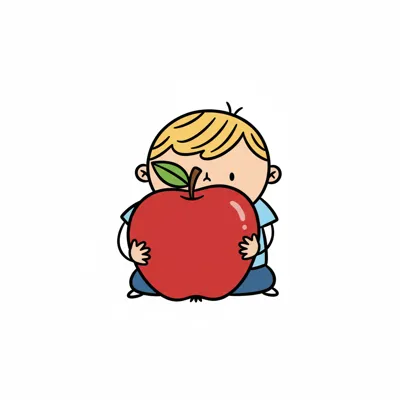 Ein Junge hält einen großen roten Apfel und lächelt fröhlich.