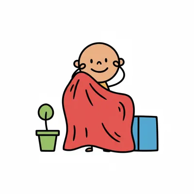 Ein Junge in einer Decke mit Wolken und Sternen sitzt fröhlich.
