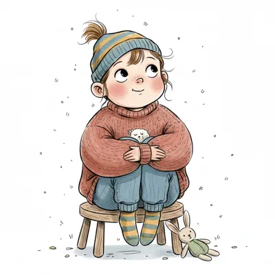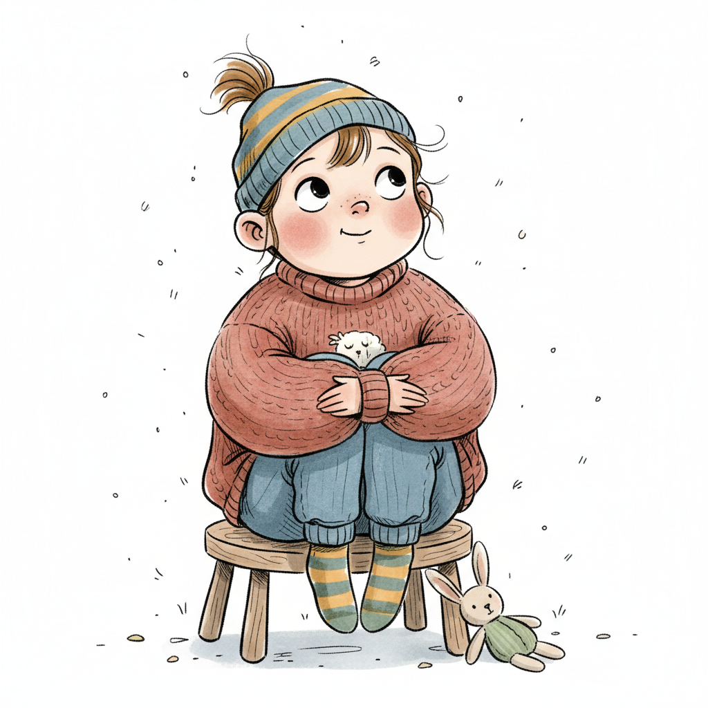 Niedliche, kindgerecht illustrierte Szene mit einem Kind oder einer Person als Hauptfigur, vor rein weißem Hintergrund, im frech-nordischen Aquarell-Skizzenstil. Klare, leicht wackelige Tuschekonturen, sichtbare Pinsel- und Strichtextur, dezente Schraffuren, weiche handgemalte Farbflächen in gedeckten Farben. Einfache, runde Formen. Keine harten Schatten, sondern sanfte, transparente Aquarellschichten. Leicht raue, handgezeichnete Linien statt glatter Vektorkanten. Subtile, vereinzelte Kritzelpunkte oder kleine Details im Hintergrund (wie Pünktchen oder feine Striche), aber keine echte Umgebung oder Landschaft. Die Figur ist mittig zentriert. Insgesamt charmant, humorvoll, warm und handgemacht wirkend. WICHTIG: Das Bild darf ABSOLUT KEINEN TEXT, KEINE BUCHSTABEN und KEINE ZAHLEN enthalten.