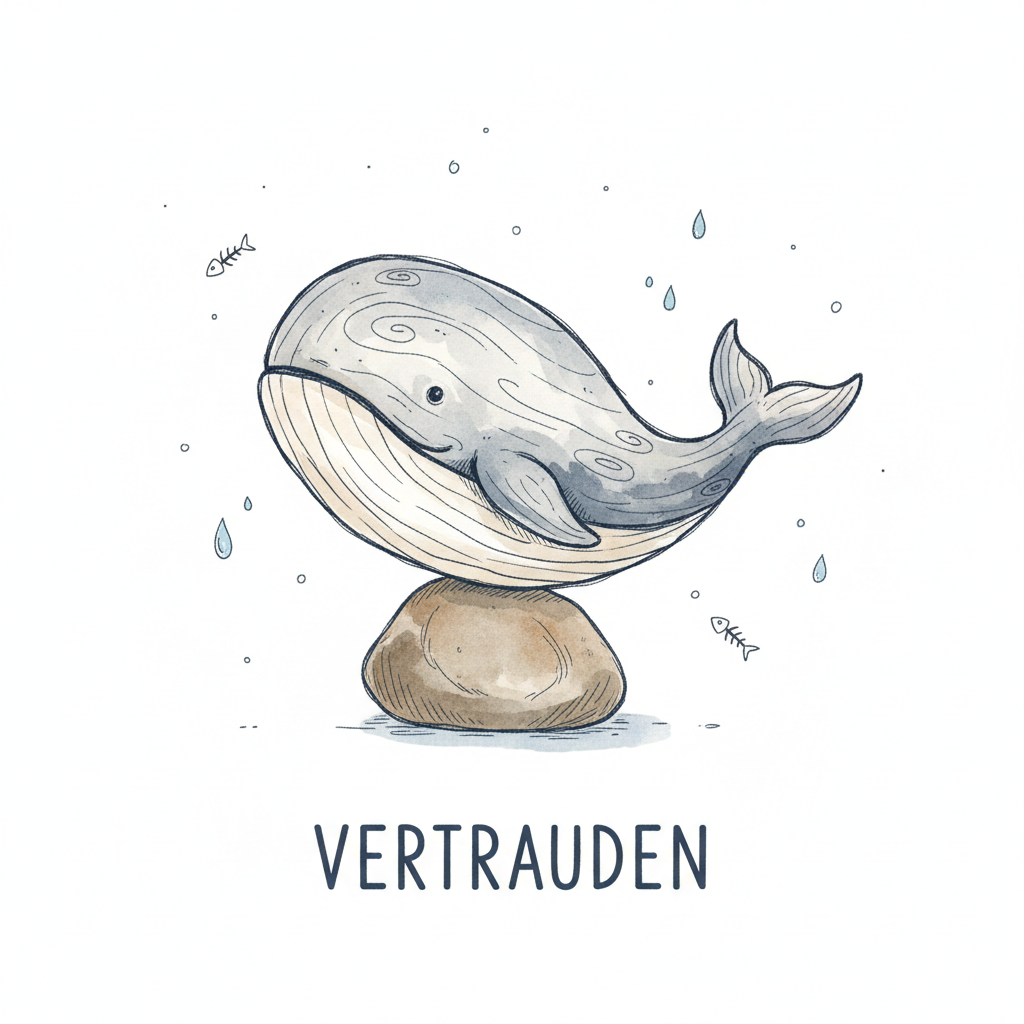 Aquarell-Illustration eines Wals, der auf einem Stein balanciert, mit dem Wort 'VERTRAUEN'.