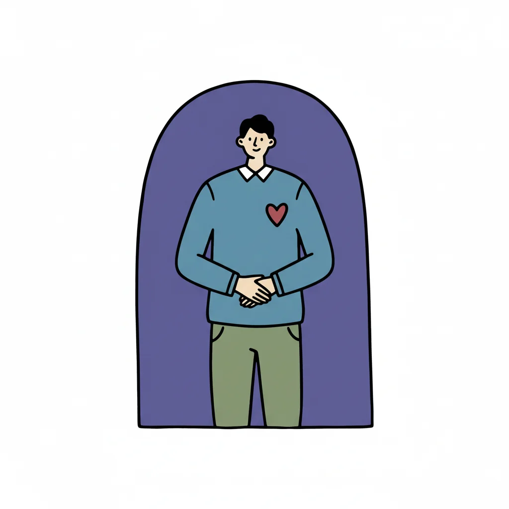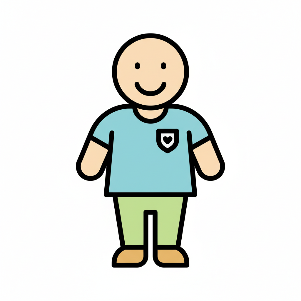 Stilisierte Figur eines lächelnden Menschen in blauem Shirt mit Herz-Schild.