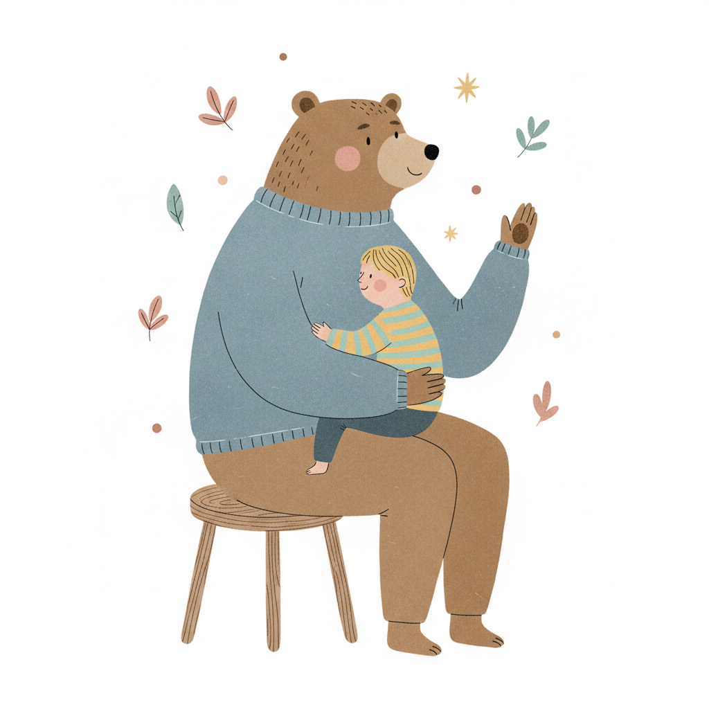 Illustration: Ein Bär im Pullover hält ein Kind auf dem Schoß und winkt.