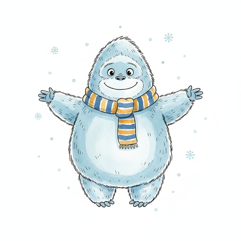 Ein lächelnder, blauer Yeti mit gestreiftem Schal und ausgebreiteten Armen im Schnee.
