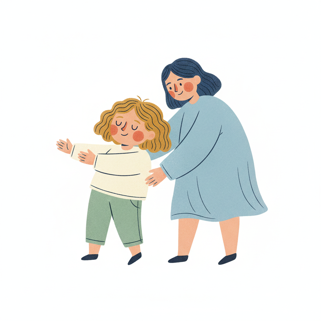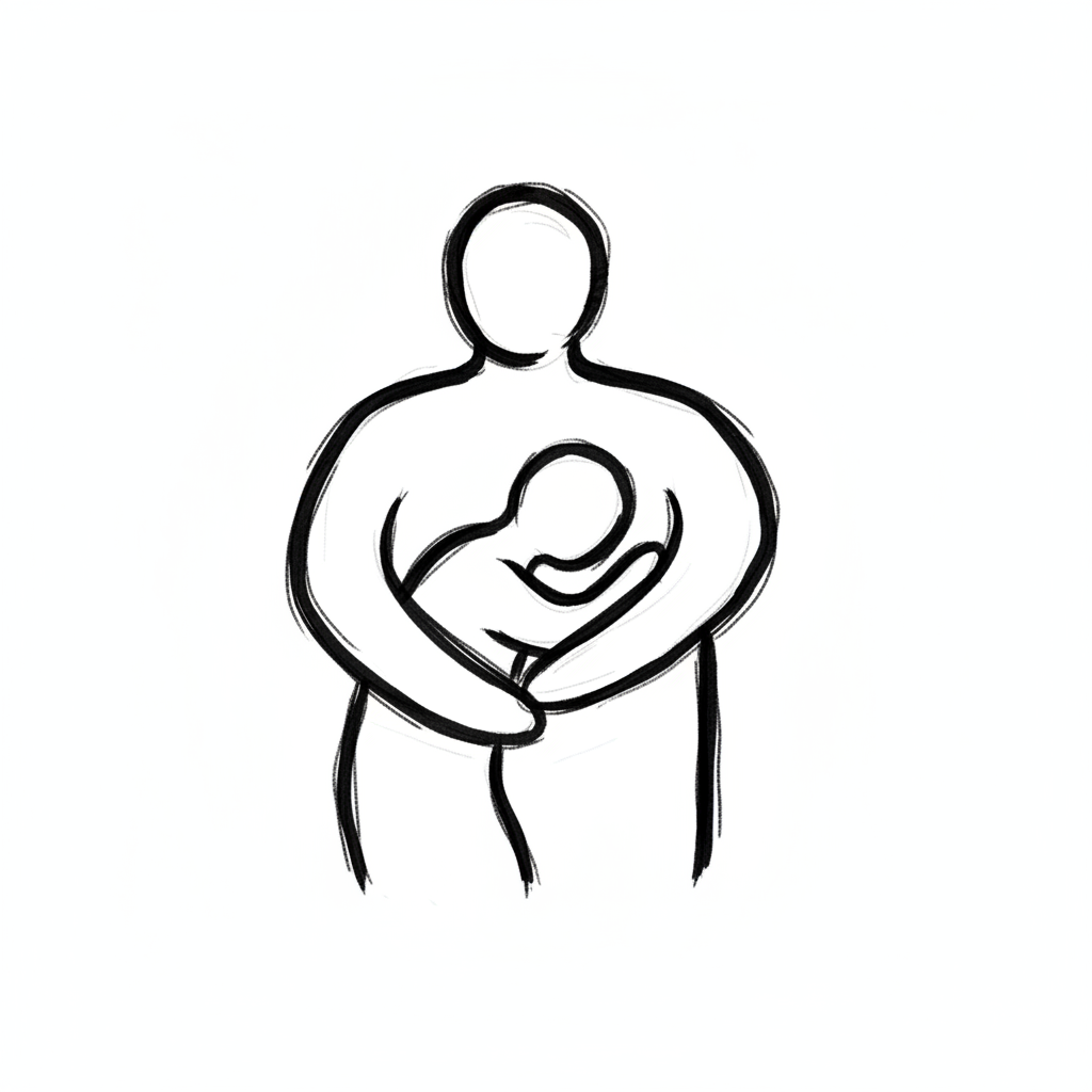 Minimalistische Zeichnung einer Person, die ein Kind liebevoll hält.