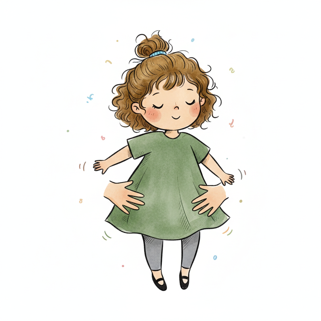 Niedliche, kindgerecht illustrierte Szene mit einem Kind oder einer Person als Hauptfigur, vor rein weißem Hintergrund, im frech-nordischen Aquarell-Skizzenstil. Klare, leicht wackelige Tuschekonturen, sichtbare Pinsel- und Strichtextur, dezente Schraffuren, weiche handgemalte Farbflächen in gedeckten Farben. Einfache, runde Formen. Keine harten Schatten, sondern sanfte, transparente Aquarellschichten. Leicht raue, handgezeichnete Linien statt glatter Vektorkanten. Subtile, vereinzelte Kritzelpunkte oder kleine Details im Hintergrund (wie Pünktchen oder feine Striche), aber keine echte Umgebung oder Landschaft. Die Figur ist mittig zentriert. Insgesamt charmant, humorvoll, warm und handgemacht wirkend. WICHTIG: Das Bild darf ABSOLUT KEINEN TEXT, KEINE BUCHSTABEN und KEINE ZAHLEN enthalten.