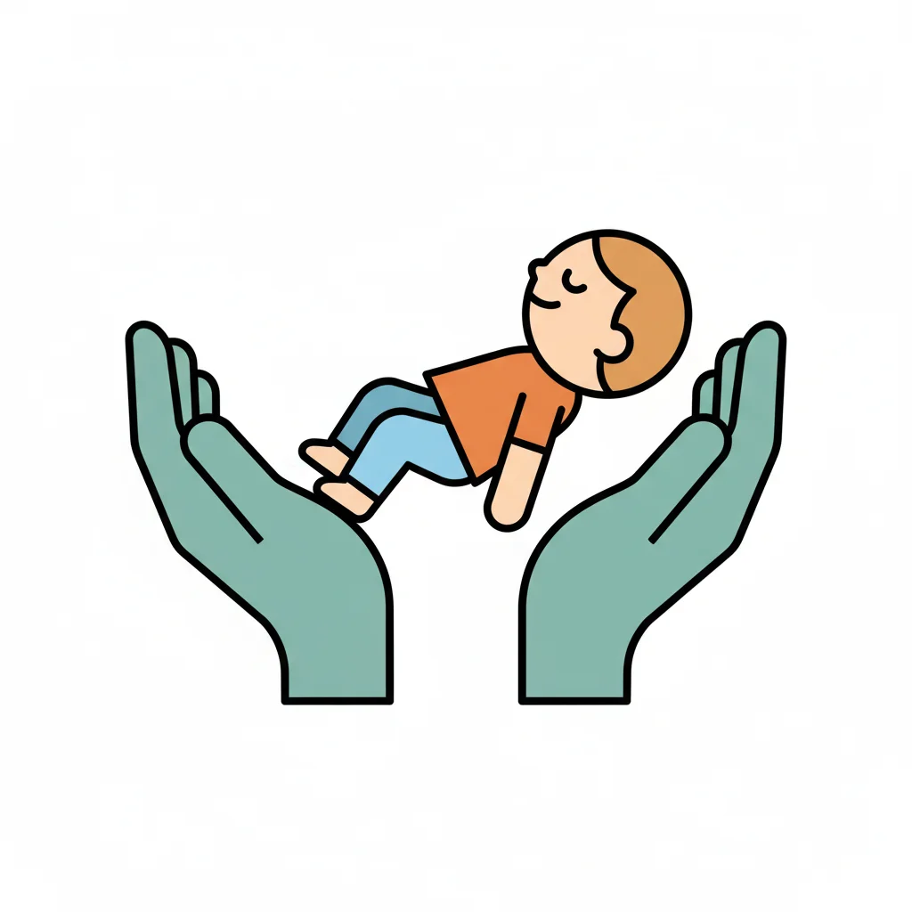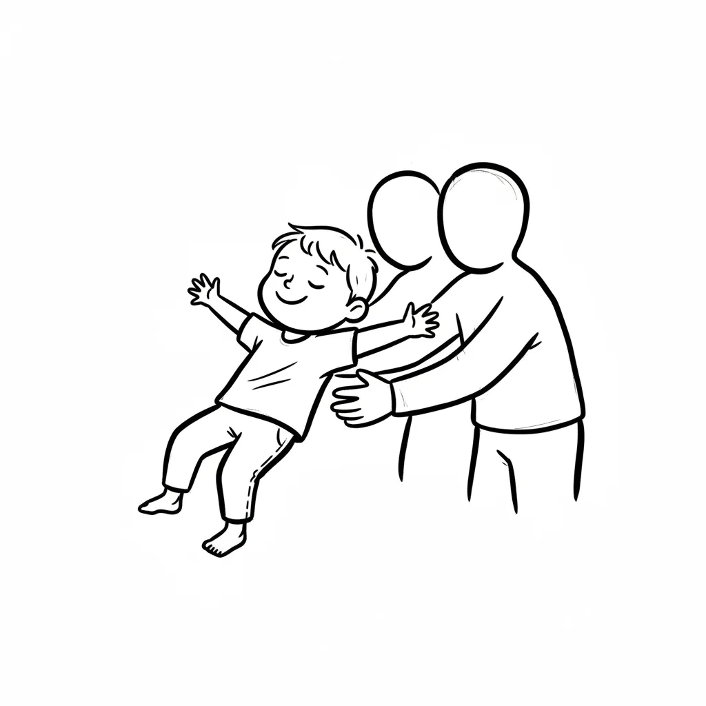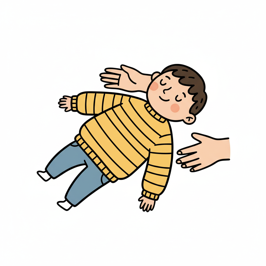 Ein lächelnder Junge wird von zwei Händen sanft gestützt oder aufgefangen. Er wirkt entspannt.