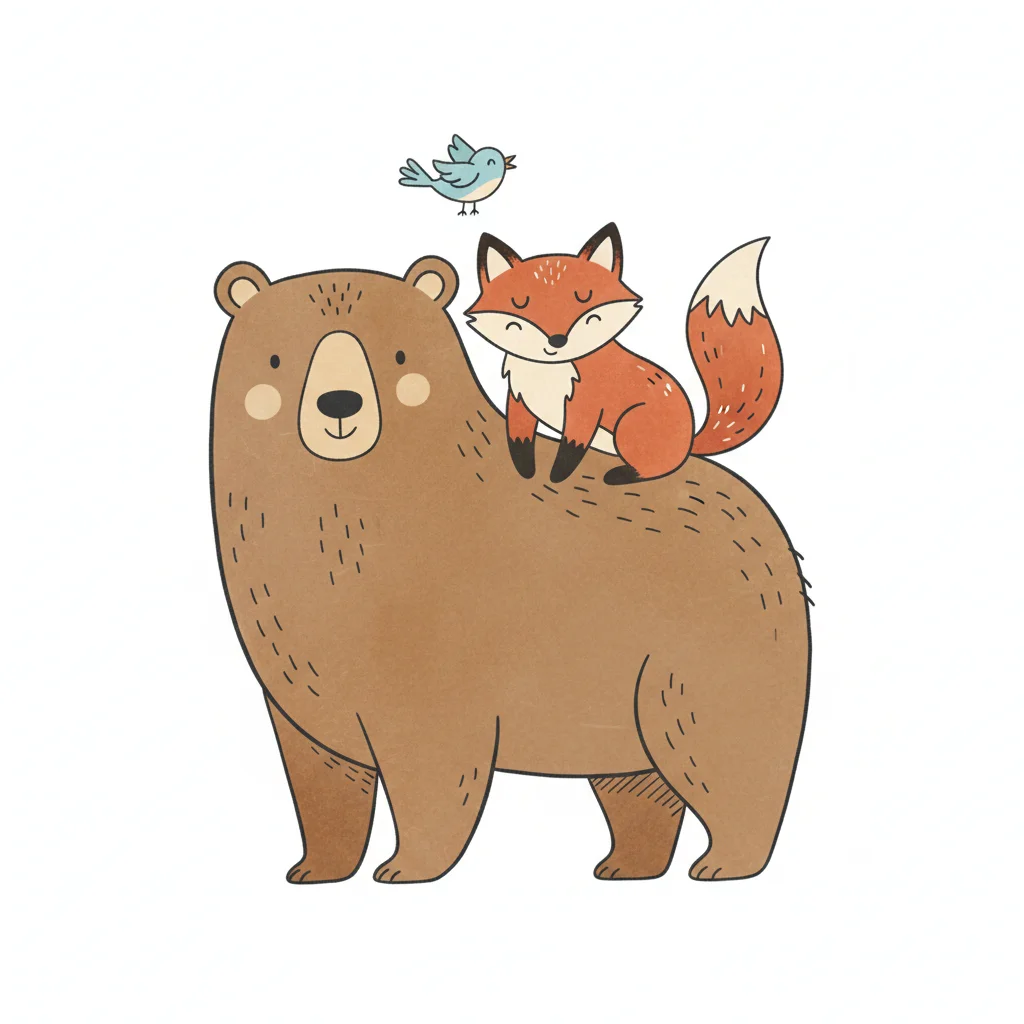 Ein freundlicher Bär trägt einen Fuchs auf dem Rücken, ein Vogel fliegt darüber. Süße Illustration.
