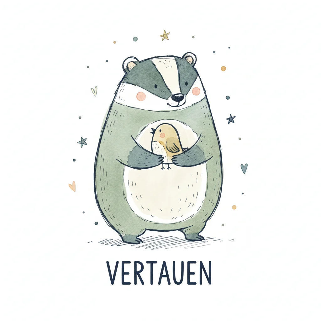 Niedlicher Dachs hält einen kleinen Vogel, umgeben von Sternen und Herzen. Unten steht 'VERTRAUEN'.