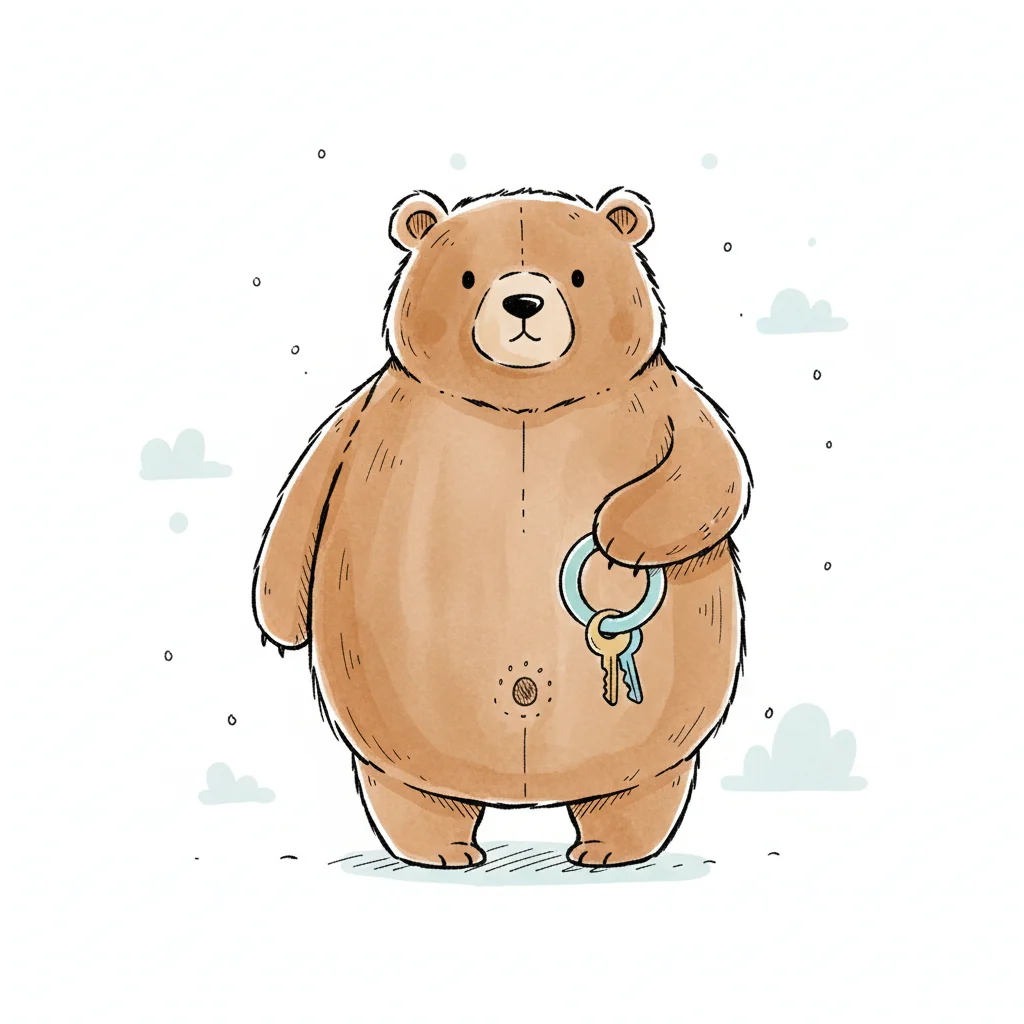 Niedlicher Cartoon-Bär hält einen Schlüsselbund mit zwei Schlüsseln. Freundliche Illustration.