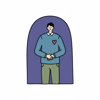 Ein lächelnder Mann mit blauem Pullover und rotem Herz steht in einem lila Bogen.