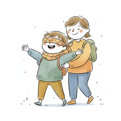 Cartoon: Erwachsener führt lächelndes Kind mit verbundenen Augen und Rucksack.