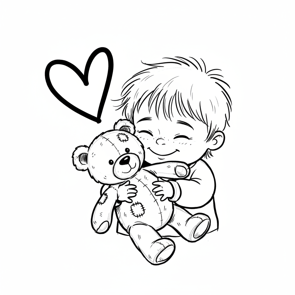 Glückliches Kind umarmt liebevoll seinen Teddybären, begleitet von einem Herzsymbol.