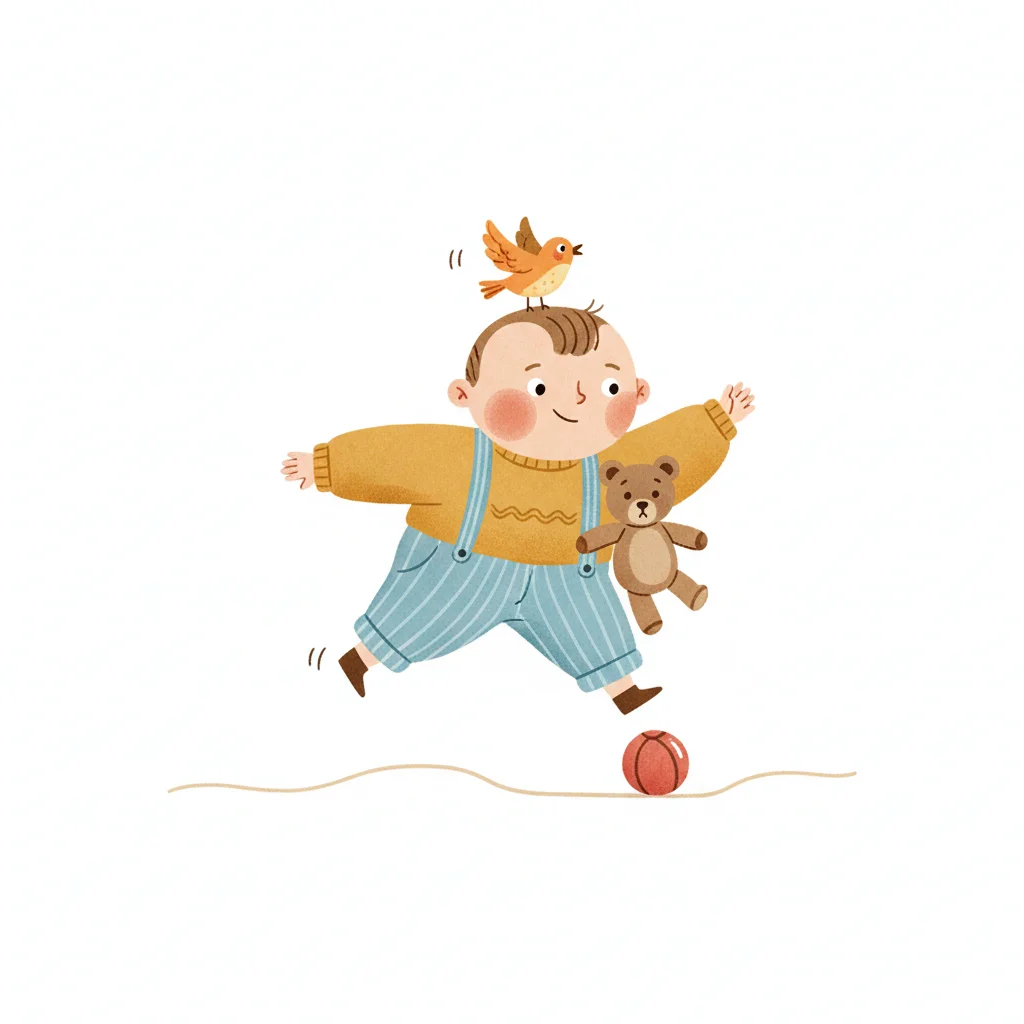Ein fröhlicher Cartoon-Junge in Latzhose und Kappe springt neben einem Ball.