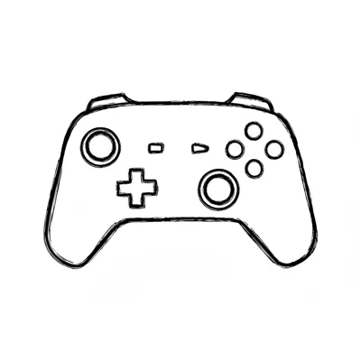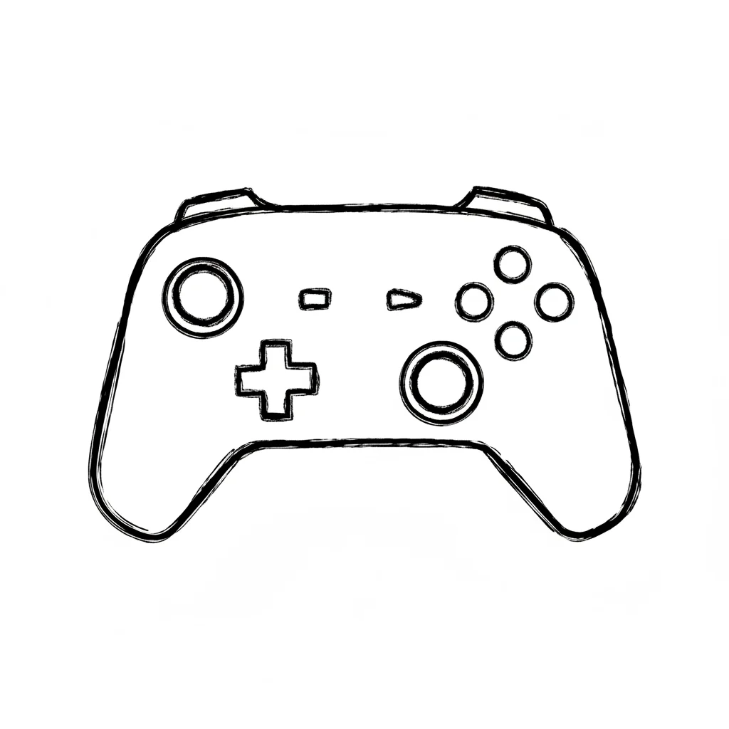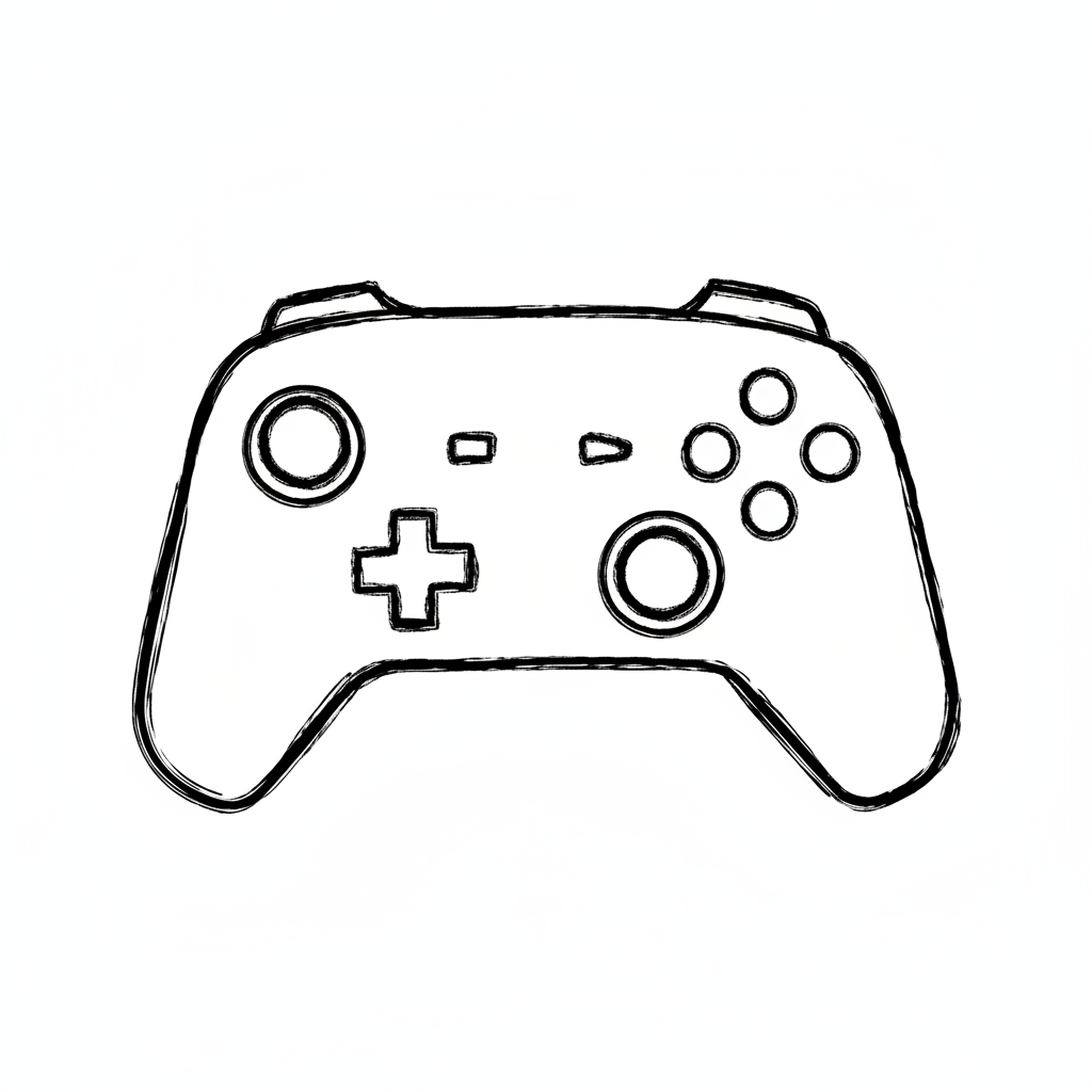 Skizzenhafte Schwarz-Weiß-Zeichnung eines Videospiel-Controllers mit Tasten und Joysticks.