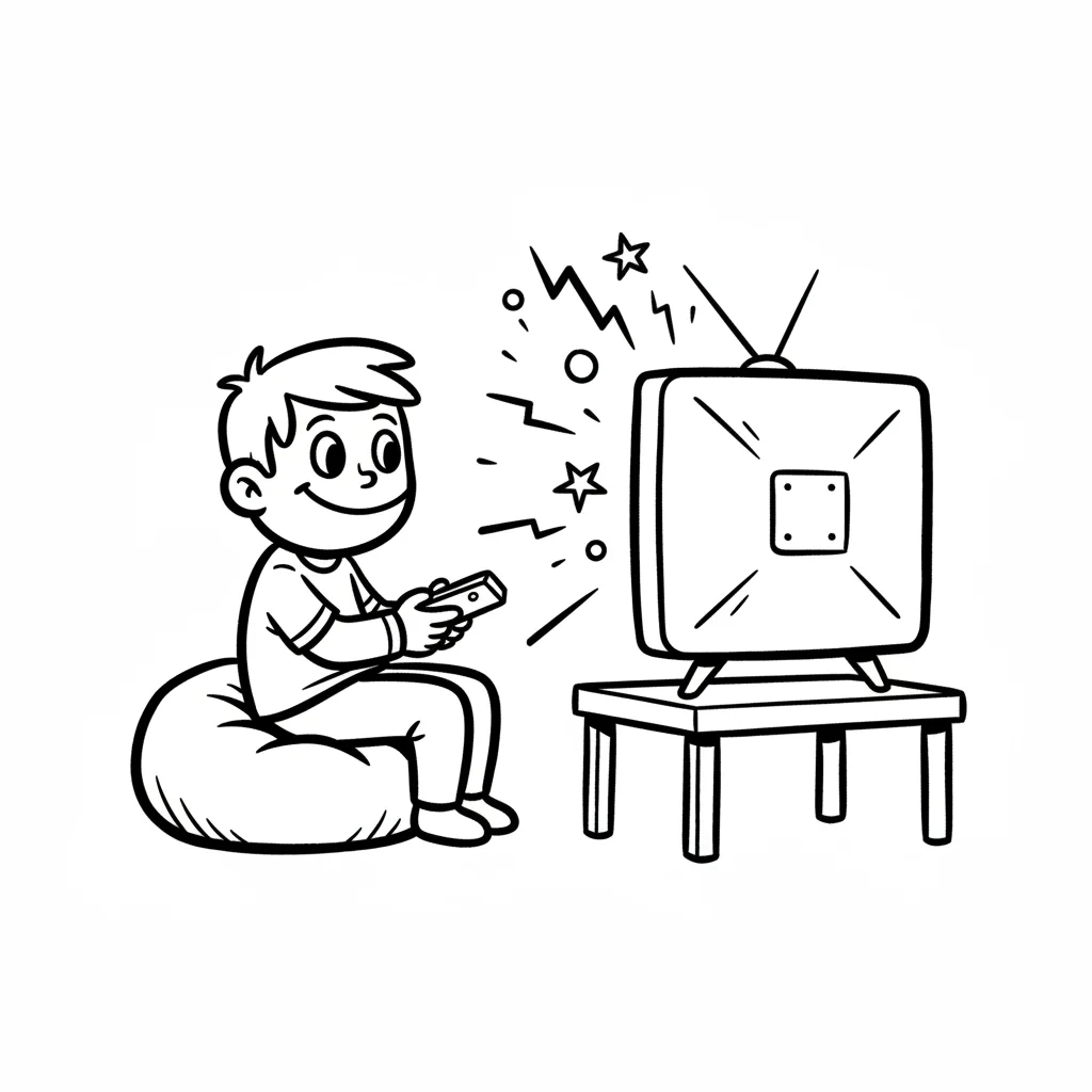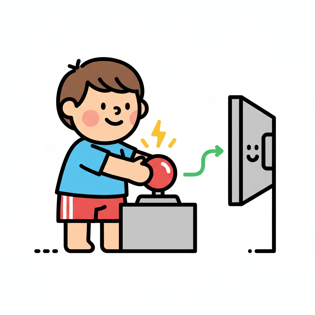 Cartoon-Junge spielt Videospiel mit Joystick, Energieblitze und lächelnder Bildschirm.