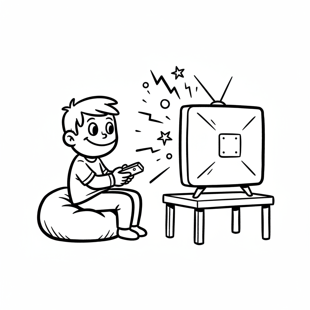Ein lächelnder Junge spielt begeistert Videospiele auf einem alten Fernseher, sitzt auf einem Sitzsack.