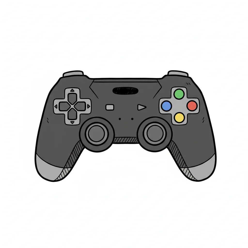 Eine gezeichnete, dunkle Videospiel-Controller-Illustration mit farbigen Knöpfen auf weißem Hintergrund.