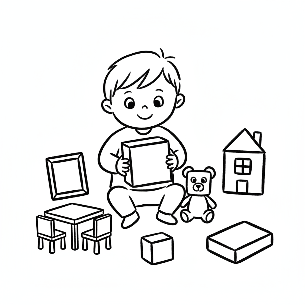 Schwarz-weiß-Zeichnung eines Babys, das mit Bauklötzen, Teddybär und Spielzeugmöbeln spielt.