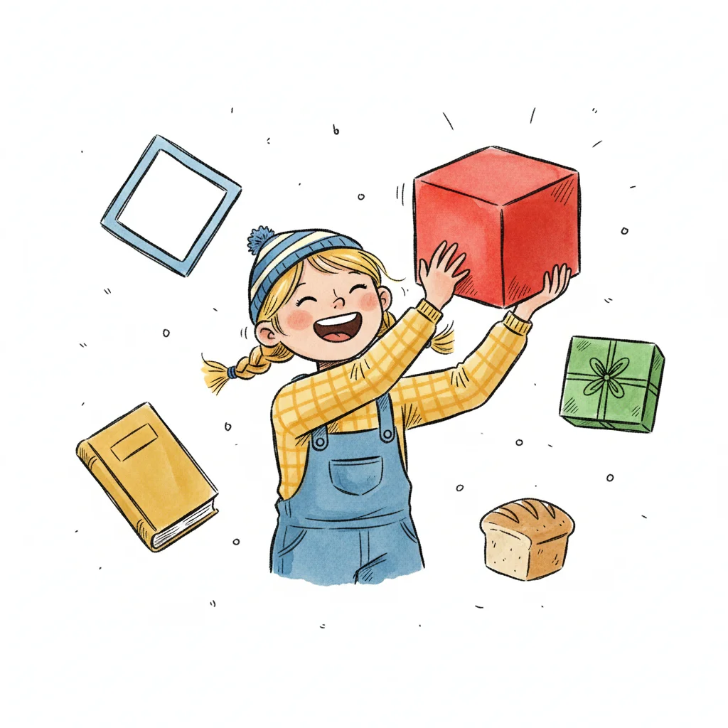 Fröhliches Mädchen hält roten Würfel, umgeben von schwebenden Gegenständen wie Buch und Brot.