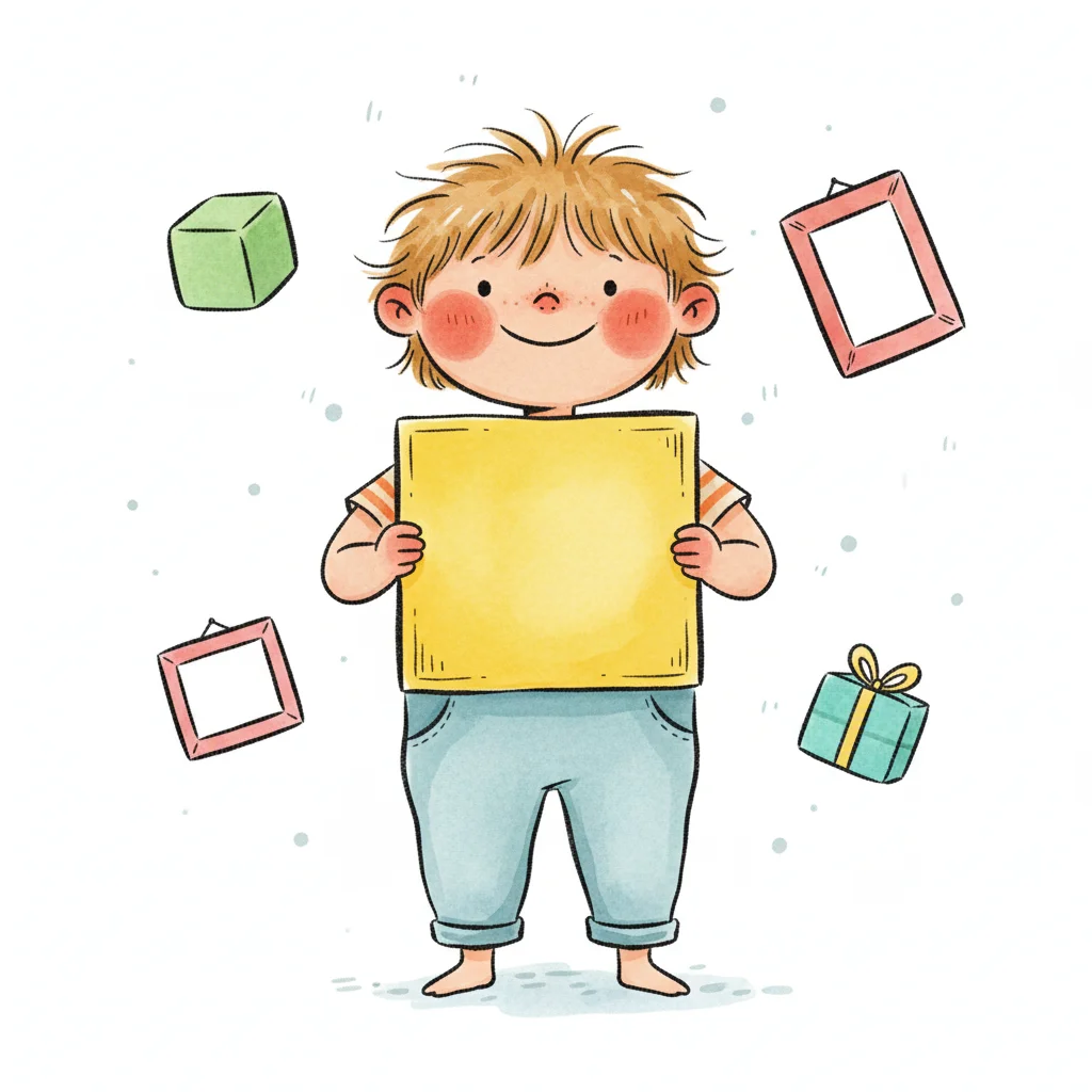 Ein lächelndes Kind hält ein leeres gelbes Schild, umgeben von schwebenden Würfeln, Rahmen und Geschenken.