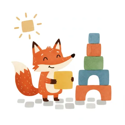 Ein lächelnder Fuchs baut einen Turm aus bunten Bauklötzen unter der Sonne.