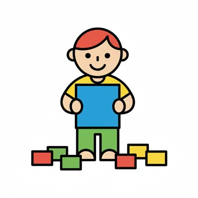 Ein lächelnder Cartoon-Junge hält einen blauen Baustein, umgeben von bunten Klötzen.