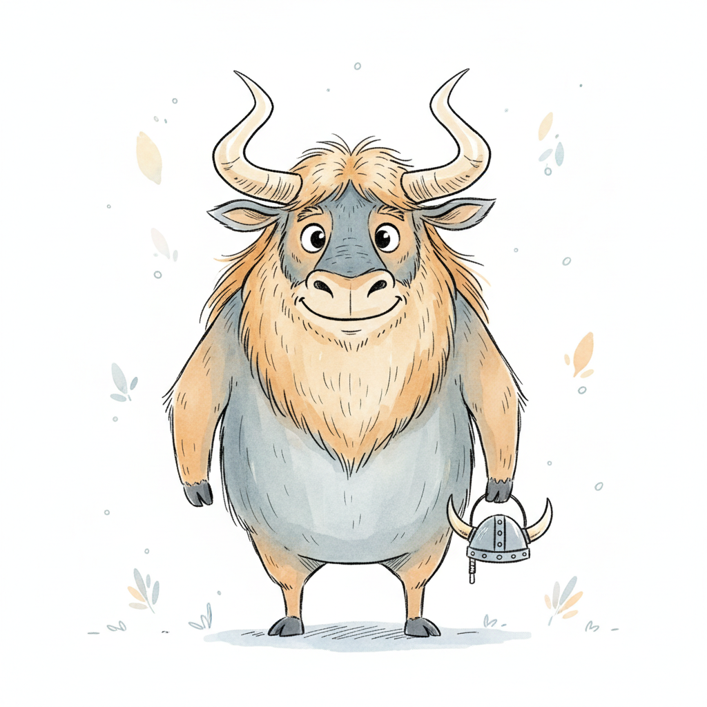 Ein fröhliches, bärtiges Tier mit Hörnern und einem Helm in der Hand.