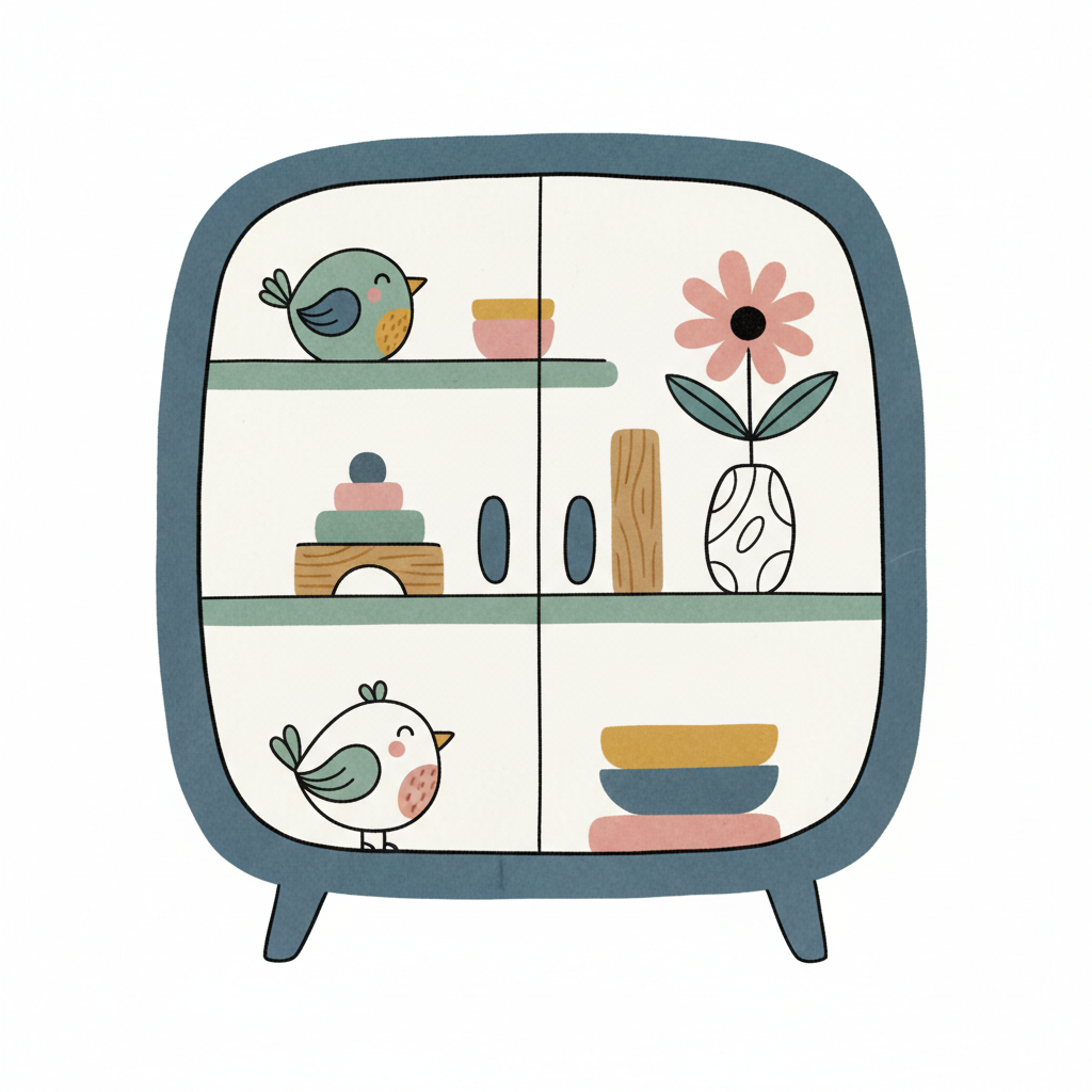 Runder Schrank mit niedlichen Stofftieren und Vögeln in sanften Farben, kinderfreundliche Illustration.